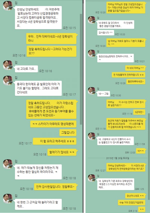 정말 놀라운 소식이네요. 민균이 아버님께서 보내주신 카톡내용에 얼마나 놀랬는지 모릅니다. 민균이는 고2 9월학기에 교환학생을 참가했는데, 당시에 게임중독 학생이었습니다. 교환학생으로 미국에 출국하는 하루 전까지 싫어서 버텼던 학생이었죠. 교환학생을 통해 엄청난 변화가 이루어졌습니다. 고려대 산업경영공학 합격 서강대 컴퓨터공학 4년 장학생 합격 동국대 한의예 합격 정말 놀라운 이야기가 아닐 수 없습니다. 올 여름 대학컨퍼런스에서 발표하여 후배들에게 멋진 노하우를 들려주길 기대합니다 :) |