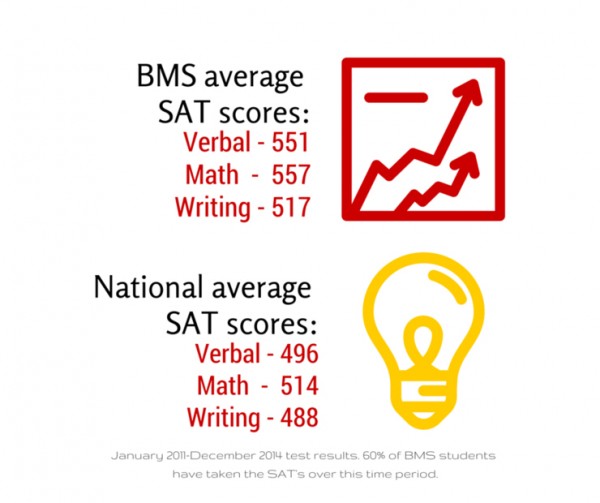 BMS는 펜실베니아 주의 소도시, Belleville에 위치한 기독교 사립학교입니다. PK부터 12학년까지 총 20명 중 9-12학년은 50명 정도가 됩니다. 기독교 사립 학교 중에서는 작은편이지만 결코 작다고 무시할 수 없는 학교랍니다. 자 아래가 보이시나요? National Average SAT score보다 높은 점수들을?