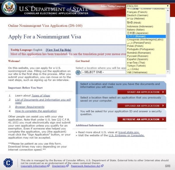 우선 DS160이라는 것은 ‘비이민 비자 신청서’의 서류 이름이다. 지칭할 때마다 ‘비이민 비자 신청서’라고 하면 너무 기니까 그냥 서류 명칭인 DS160 이라 부르는 것이다. 위 사진은 신청서를 입력하기 위한 웹페이지의 첫 화면이다. 당연히 영어로 되어있지만 걱정할 필요가 없다. 사진에도 보여지듯이 한국어를 선택할 수 있으며 선택 후 영어 질문에 마우스를 올려 놓으면 한국어 해석이 친절하게 나온다.