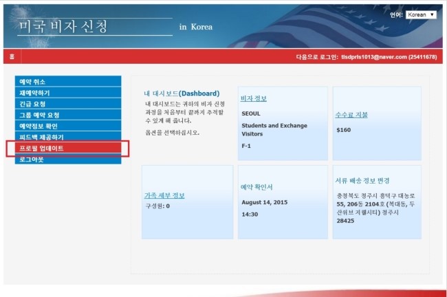 이렇게 프로필 업데이트를 클릭하면 손쉽게 DS-160 확인번호를 바꿀 수 있다.