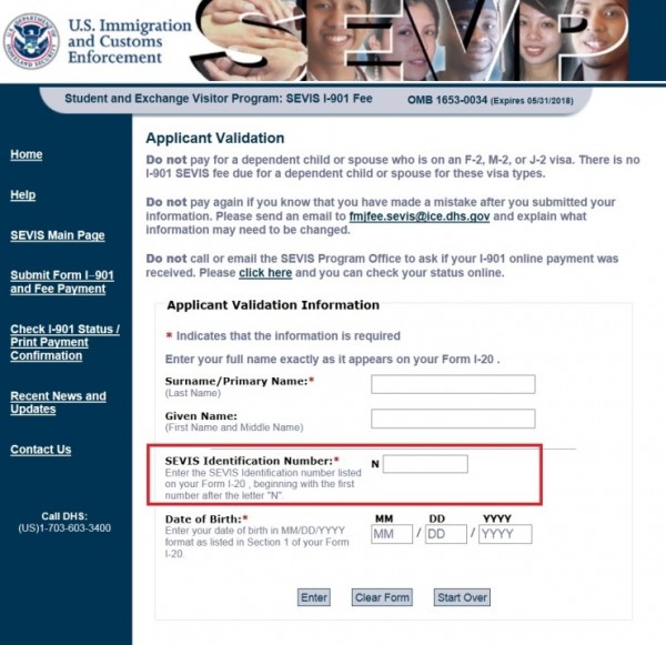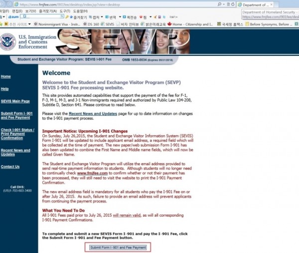 SEVIS라는 것은 The Student and Exchange Visitor Information System의 약자로서 미국 국토 안보부에서 학업을 위해 미국에 체류하는 미국 유학생이나 교환학생을 모니터링 하기 위해 발급하는 문자와 숫자가 섞인 학생 고유 번호이다. 이것이 온라인 백과사전에서 말하고 있는 SEVIS의 정의이다. 언뜻 보면 복잡해 보이지만 막상 해보면 정말 별 것 아니다. 아래 미국 국토 안보부의 SEVIS FEE 납부 페이지에 접속해서 요구하는 입력사항을 차근히 입력하기만 하면 된다.
