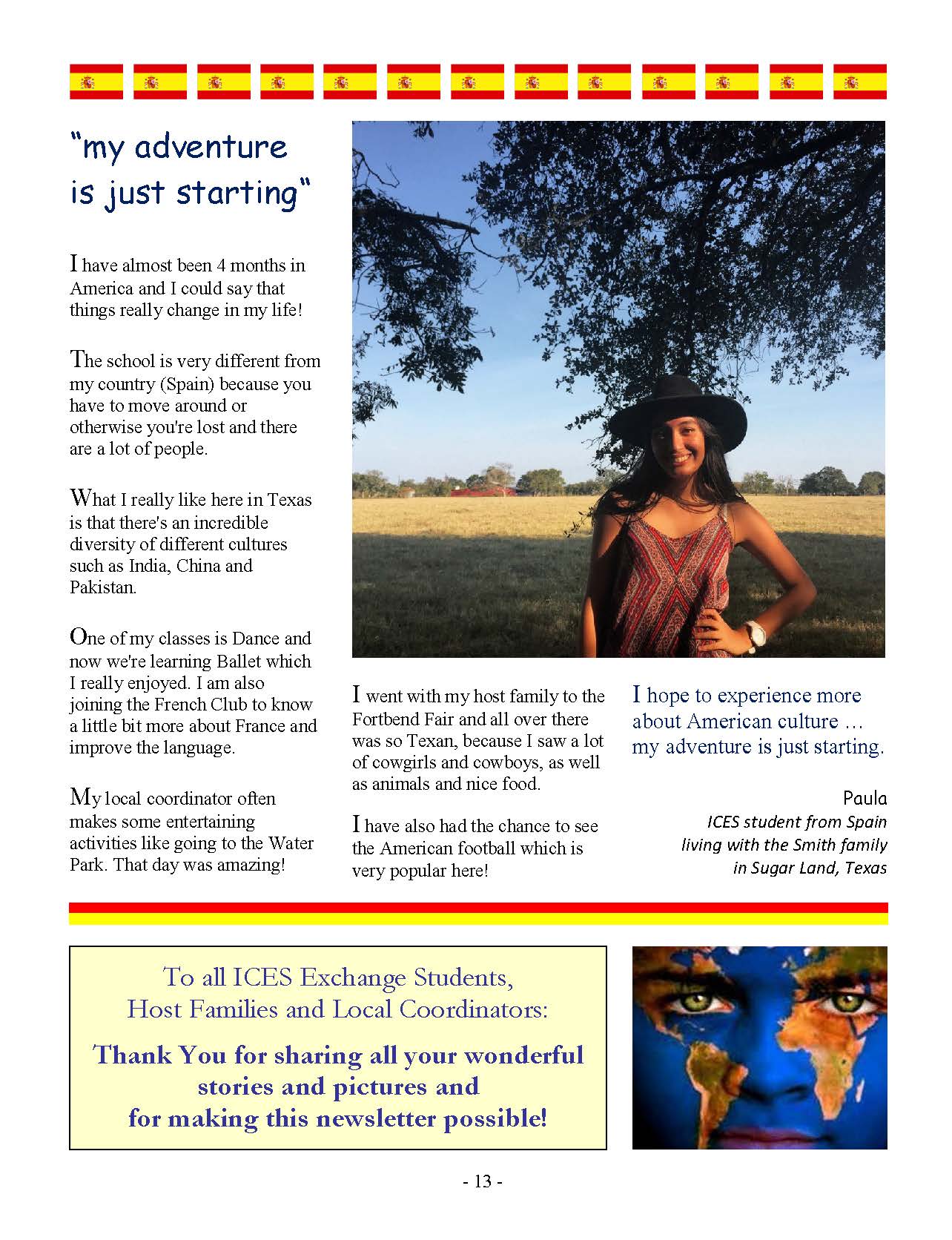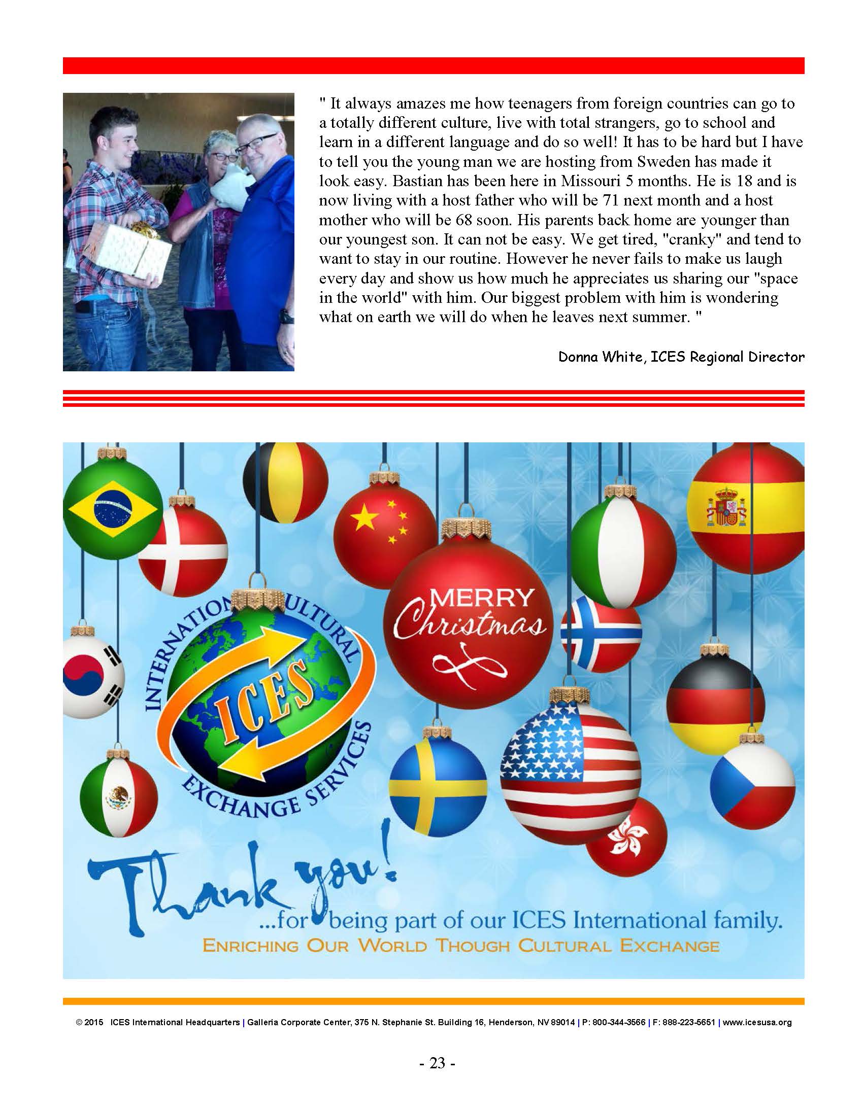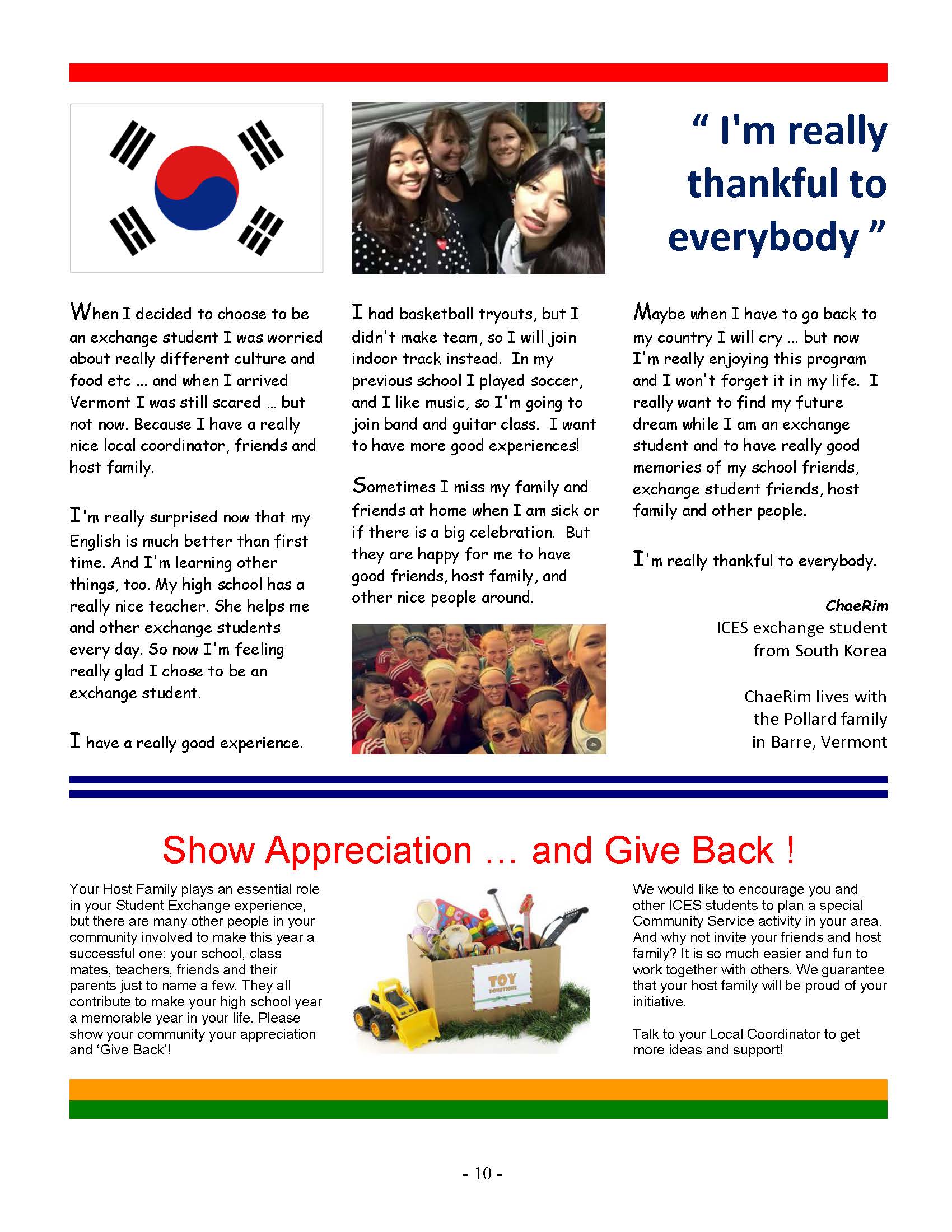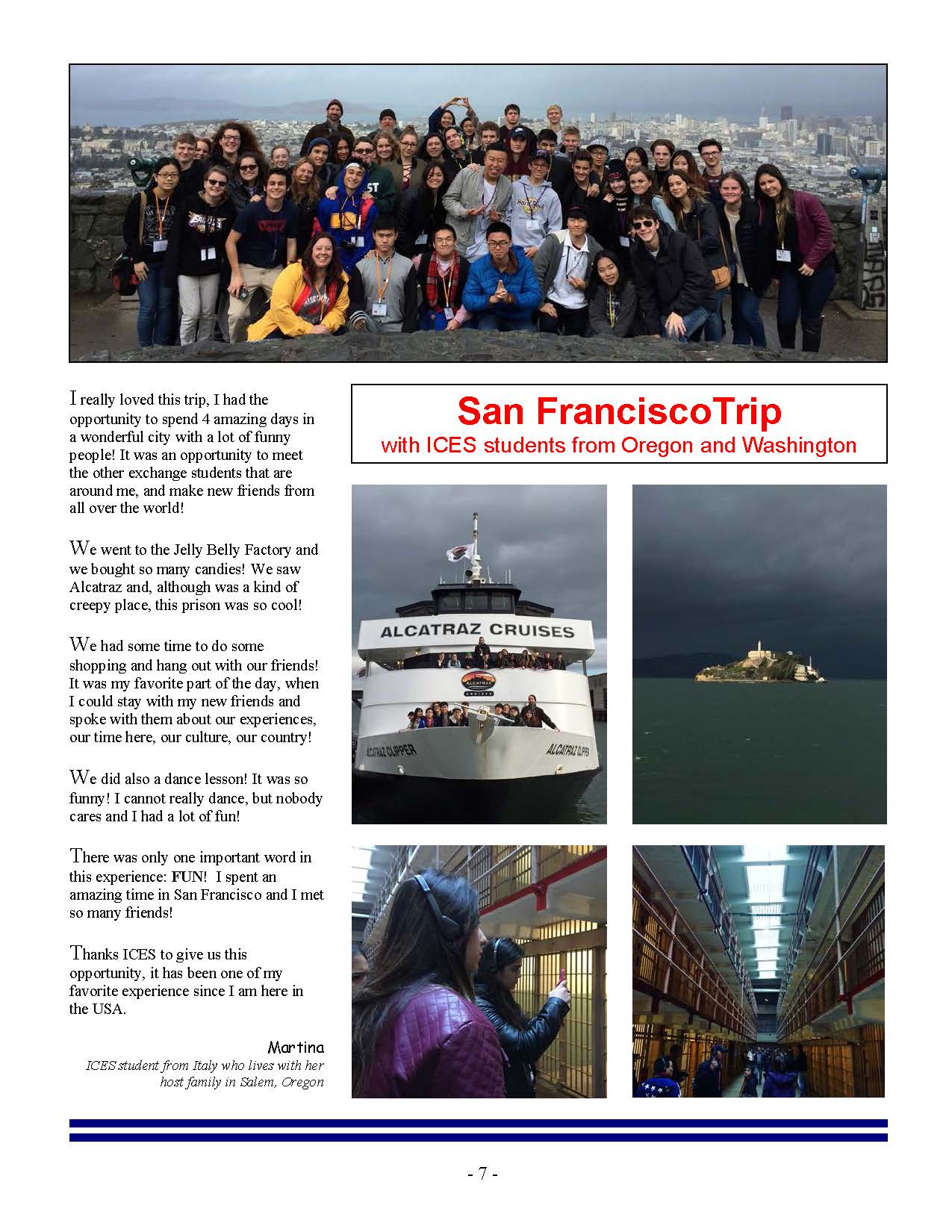 오늘은 저희 밝은미래교육의 교환학생 파트너社 중 하나인 ICES에서 연말 인사가 포함된 사보를 보내왔습니다. 오레건과 워싱턴주의 교환학생들은 샌프란시스코 여행을 가서 즐거운 시간을 보냈다고 합니다. 텍사스로에서 공부하고 있는 스페인에서 온 Paula 학생은 이제 4달 됐지만 교환학생의 경험이 엄청난 삶의 변화를 줬다며, 미국 뿐만 아니라 인도, 파키스탄, 중국의 문화를 접하며 세계 시민으로 성장하고 있다고 소개하고 있네요. 그 중 한국 학생의 이야기가 눈길을 끕니다. 이 학생은 떠나오기 전까지는 다른 문화와 환경을 접할것에 두려웠지만 지금은 지역관리자, 학교선생님, 친구들, 호스트가족들의 따뜻한 배려에 굉장히 만족하고 감사하고 있다고 합니다. 처음 도착했을 때보다 눈에 띄게 성장한 영어실력과 함께 축구도 하며 육상부와 밴드, 기타 수업도 들을 예정이라고 하네요^^ 미국 교환 학생을 하면서 꿈을 발견했다는 채림양. 위에 소개된 학생들처럼 넓은 세계와 새로운 친구들을 사귀고 싶지 않으신가요? ^^ |